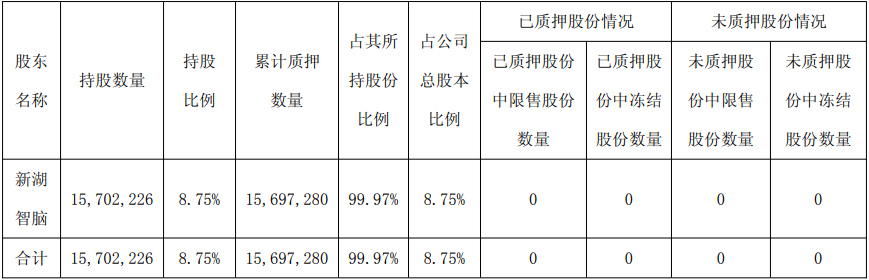 截至本公告披露日,新湖智脑累计质押股份情况如下: